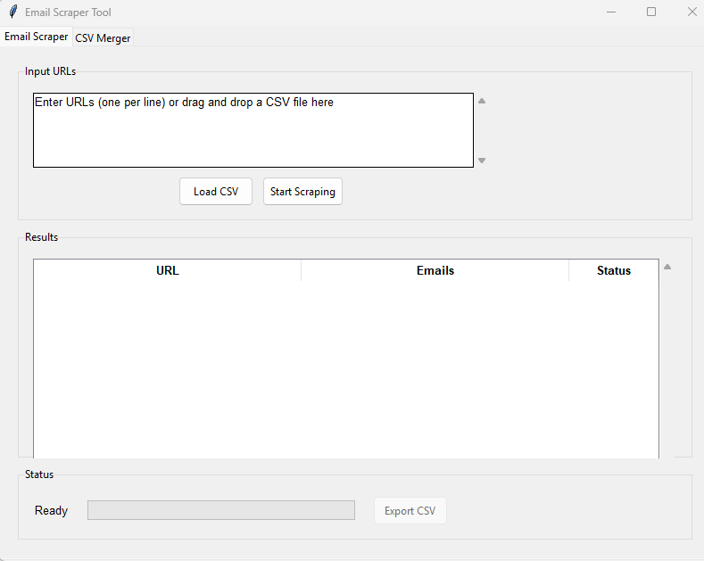 Locate the .exe file within the \dist folder. Once you run the .exe, the tool will launch. Upload your CSV file that contains the website URLs, ensuring the relevant column is titled either "website" or "URL." Click on "Scrape" to begin. When the process is complete, export the CSV to your desired location.